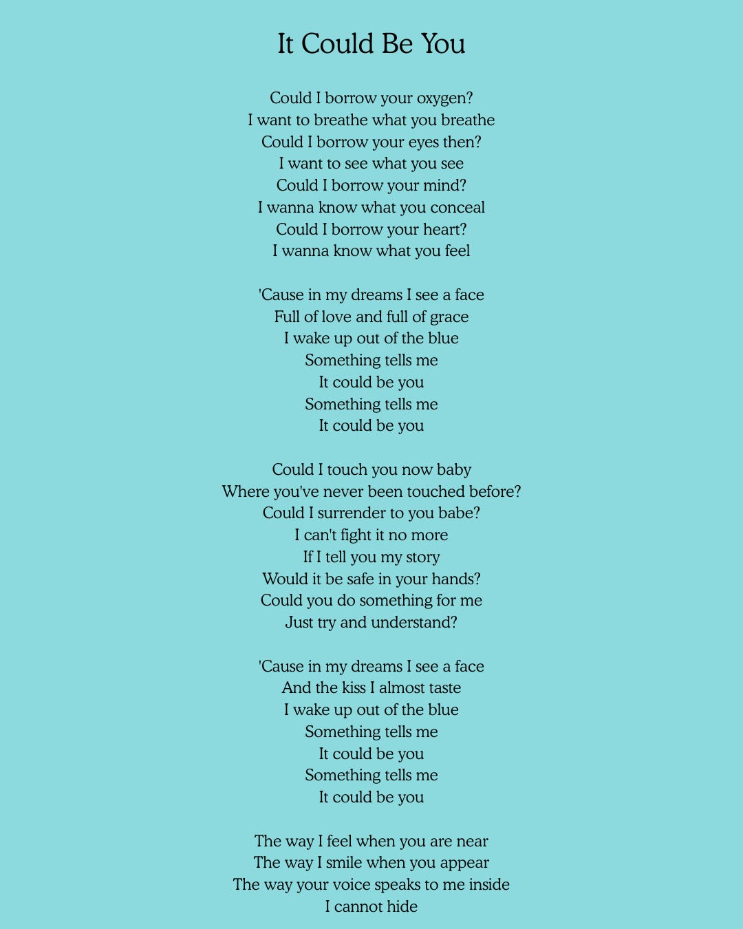 I couldn’t imagine that anyone could write my voice. I was a girl fer crissakes, not yet a woman and how would this older dude know my experience?!! But despite my arrogance, I found myself in awe as I leafed through his lever arch file- I recognised my experiences in the black and white print and withing a few page flips found a lyric set I instantly connected with. It was called, ‘It Could Be You’.